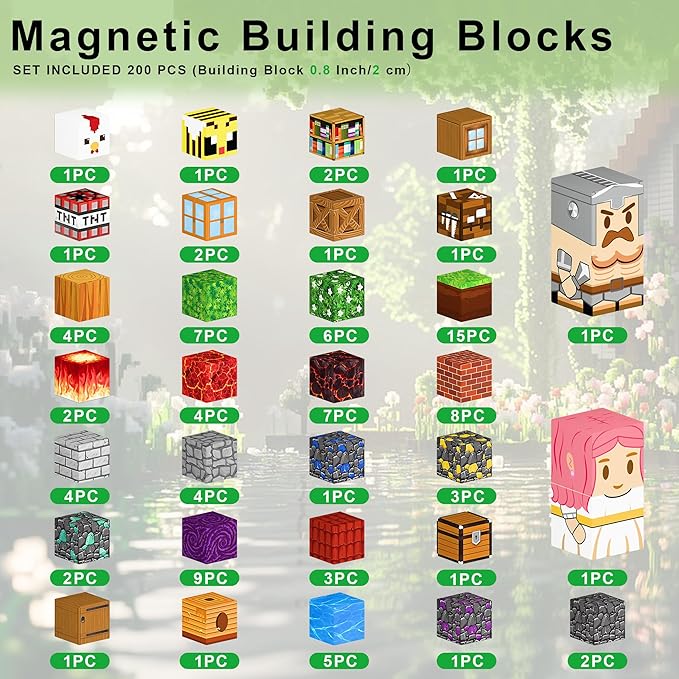 200PCS Magnetic Blocks - Build Mine 3D Forest Lava Set, 0.8in Magnet Building Cubes Toys for Kids Ages 3+, STEM Magnetic Building Blocks Set Birthday Gift for Boys and Girls