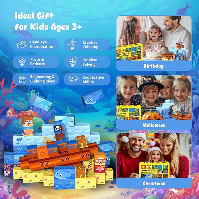 Magnetic Blocks— 120PCS Magnet Toys for Kids, Magnetic Building Blocks Cubes, Montessori Sensory Stacking Magnets, School STEM Toys Birthday Gifts for Boys and Girls Age 3+ Years Old (Ocean Explore)