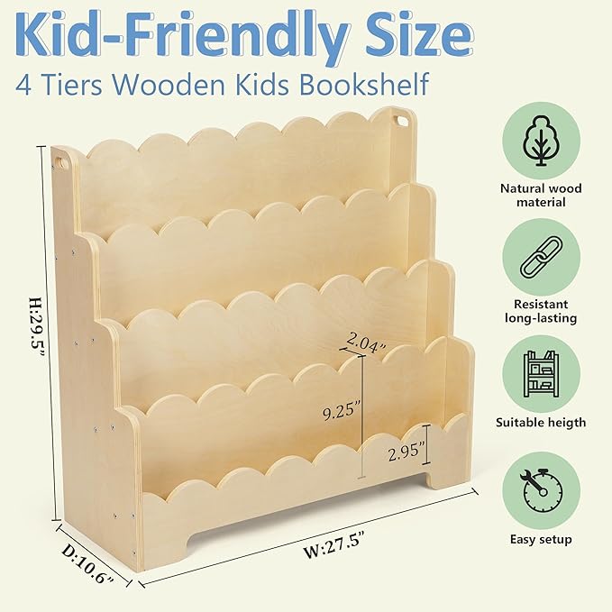 Kids Bookshelf Wooden 4-Tier, Scalloped Book Shelf for Kids Rooms, Front Facing Toddler Montessori Bookshelf, Baby Nursery Book Shelves Kid Classroom Book Shelf Bookcase