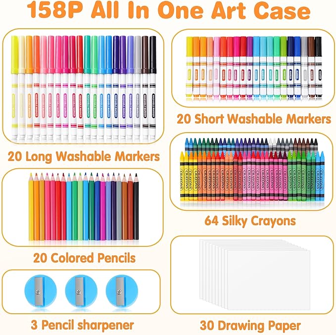 - All-In-One 158-Piece Art Supplies Kits: This complete art set includes 1 storage art case, 20 long washable markers, 20 short washable markers, 20 short colored pencils, 64 crayons, 3 pencil sharpeners, and 30 large 11.8"x8" drawing paper—covering all basic coloring supplies kids need for painting, coloring, and crafts. It’s the perfect entry-level art kit to kickstart their creative journey.