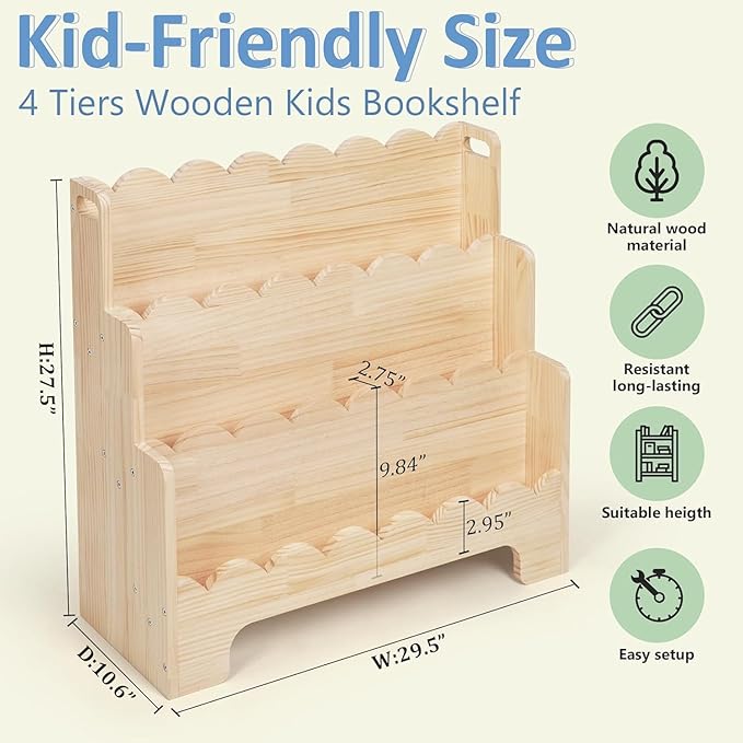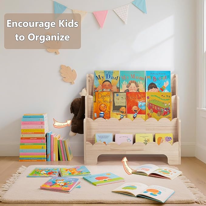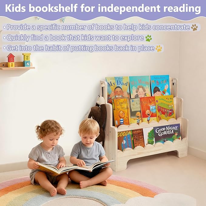 - Natural Material & Stable: Made of solid pine wood, this bookshelf for kids features a triangular support structure ensures stability and prevents tipping over. The baby bookshelf cares the safety of your little ones.