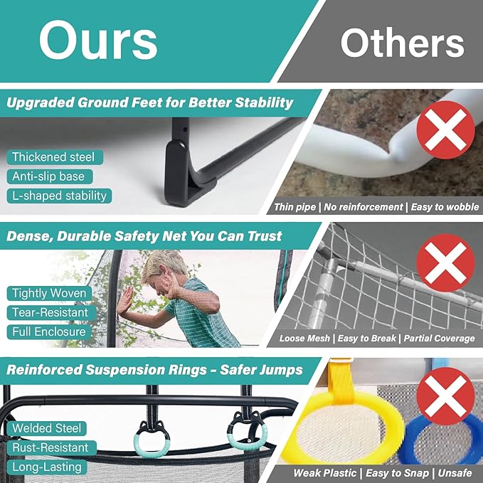 - Enhanced Safety with Gap-Free Design:Our no-gap jumping mat and frame design prevents foot pinching, giving your little ones a safer bouncing experience. Ideal for toddlers and small kids aged 3–6.
