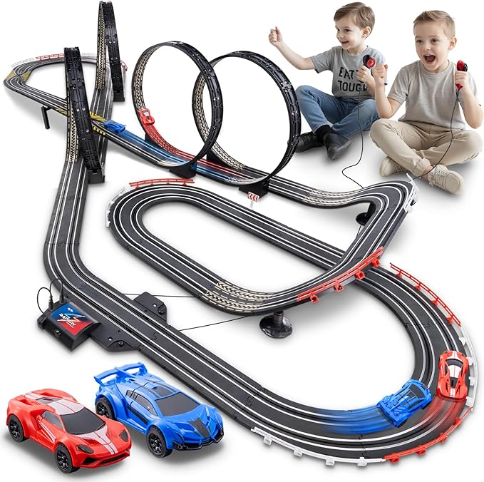 - 【Two Players with Electric Controllers】: This slot car race track set toy is designed for two players, great for kids boys girls aged 3 4 5 6 7 8 9 10 11 12. It includes two electric-powered controllers with trigger-style speed adjustment, providing precise control for high-speed racing. This encourages friendship and family play, allowing children to compete with siblings, friends, or parents while enjoying interactive fun.
