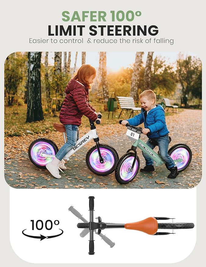 - Self-Lighting Wheels, No Batteries!: The colorful glow wheels of this toddler balance bike activate magically with motion – just ride and watch them light up! The cool lights bring added excitement, making playtime even more fun and engaging for children (No battery waste & battery costs. The self-lighting wheels of our balance bike are equipped with built-in light beads, which are more stable and durable than the external light beads of other products.