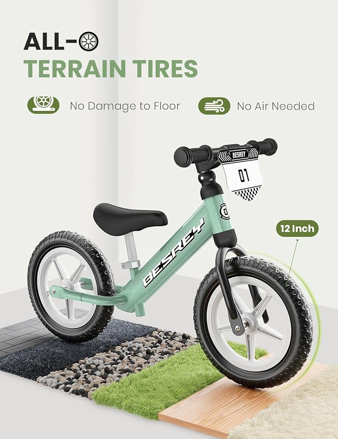 - 12" All-Terrain Tires: This balance bike 3 year old is puncture-proof. Featuring deep, multi-directional tread patterns for superior traction, these tires grip firmly on pavement, grass, gravel, and more. Combined with excellent shock absorption, they deliver a smooth, stable, and confident ride for your little adventurer, indoors and out