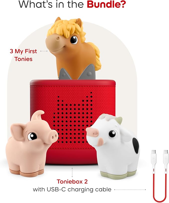 - Bundle includes a Sunset Red Toniebox 2, 8.6” [22cm] USB-C charging cable, Cow, Horse, and Pig Tonies. Power Adapter, longer charger cable, and additional Tonies sold separately. Wi-Fi needed for initial set-up. The USB-C Charging Cable is 8.6" to meet child safety standards for little listeners aged 1+.