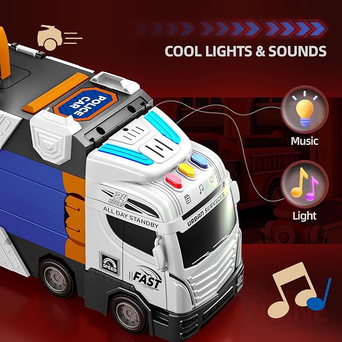 - 【21-in-1 Transport City Truck Toys for Toddlers Kids 2 3 4 5 6 7 8 Years Old】This city trucks toy set for toddlers is a blast! It comes with 20 mini cars. You can just push them around for fun, or use the truck as a cool storage spot for the cars. And here's the best part: it transforms into a 65-inch race track for competitive racing! Transport truck toys for 2 3 4 5 6 7 8 year old toddlers boys girls.