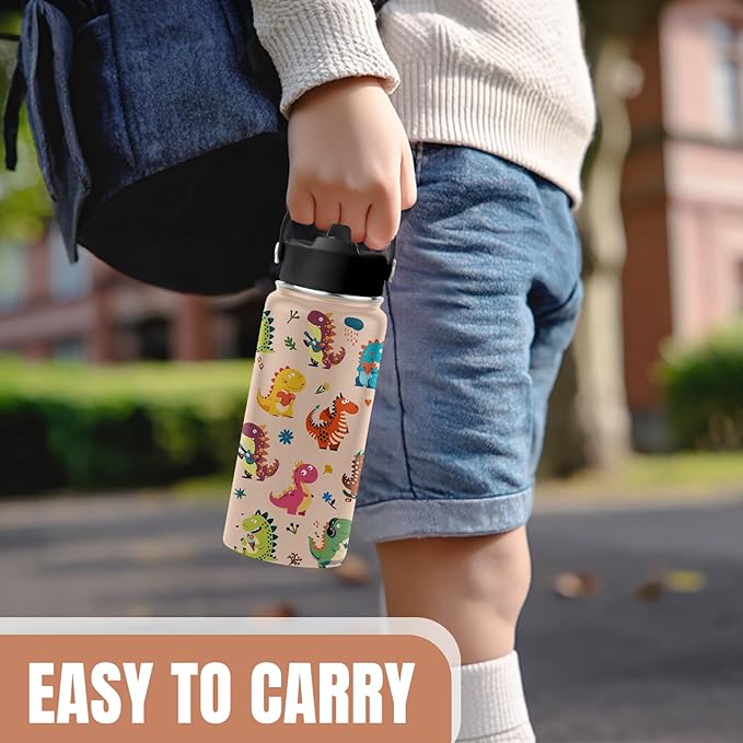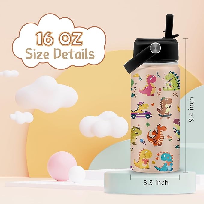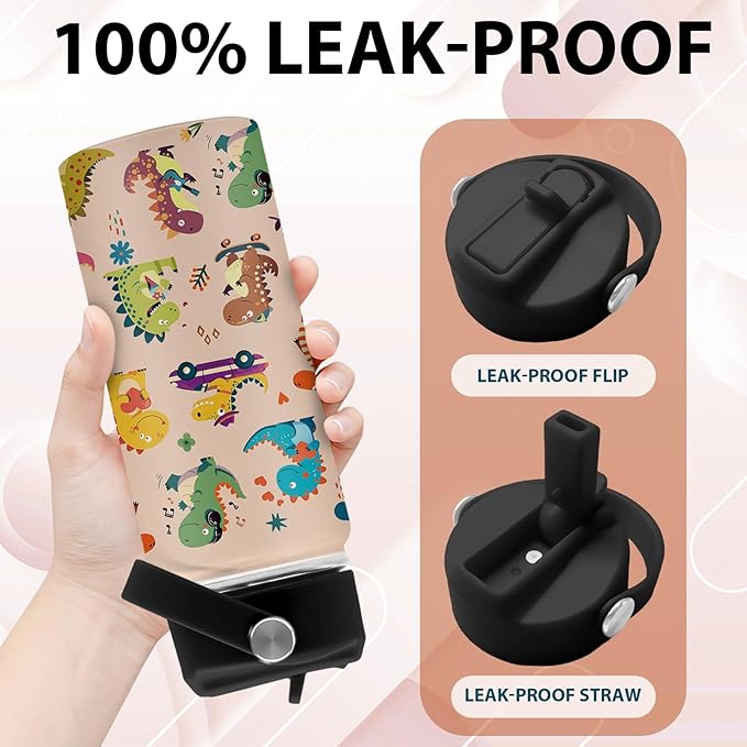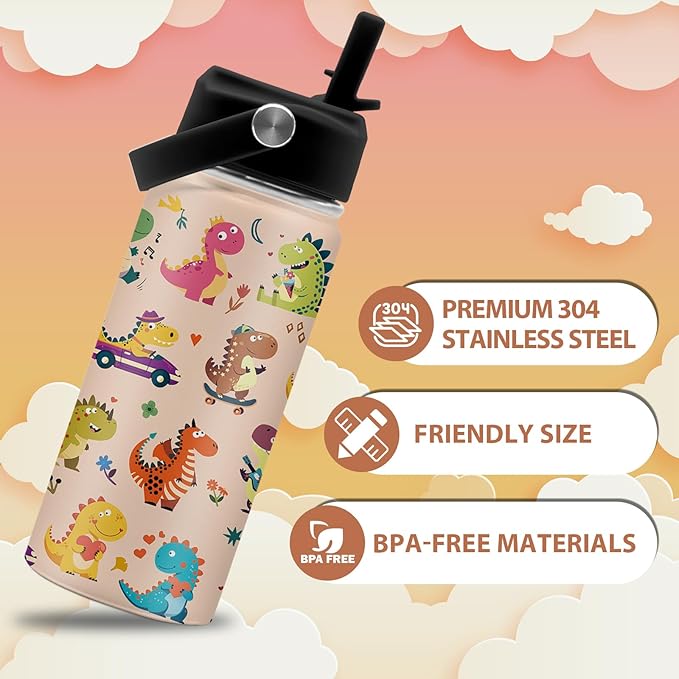 - Vacuum Insulation: The dino insulated water bottle has double-wall vacuum insulation design that keeps cold drinks warm for up to 12 hours and hot drinks warm for up to 6 hours. It also prevents condensation from forming