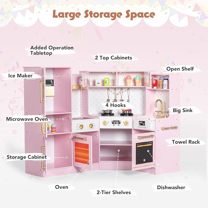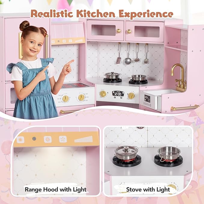Corner Play Kitchen for Kids, Wooden Toddler Kitchen Playset with Ice Maker, Oven, Sink, Range Hood with Light, Ultimate Pretend Play Toy Kitchen Set Gift for Boys Girls Age 3+, Pink