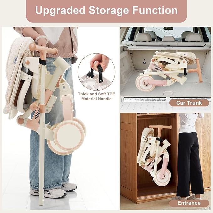 - Parent-Friendly Features for Ultimate Convenience: One-click folding system saves over 50% of storage space. Adjustable rotating seat allows face-to-face interaction, while the adjustable push handle and soft TPE grip ensure effortless control and easy transport.