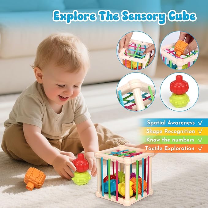 - 🧠 Multi-Sensory Learning: Textures, Sounds & Problem Solving: Spark curiosity with sensory bin textures, spinning toy clicks, and crinkle sounds. Chunky blocks with embossed animals teach color/shape recognition, while wooden puzzles build logic and counting skills—turning play into cognitive growth.