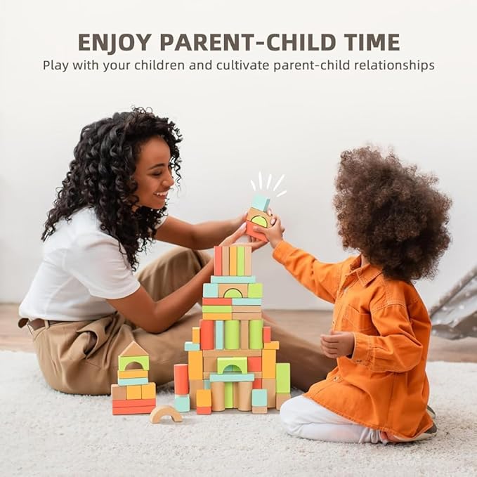 - Endless Building Fun – This colorful wooden block set includes 100 pieces in 5 vibrant colors and 11 unique shapes, giving toddlers endless options to create everything from castles and cars to bridges and rockets—all while sparking imagination and creativity.