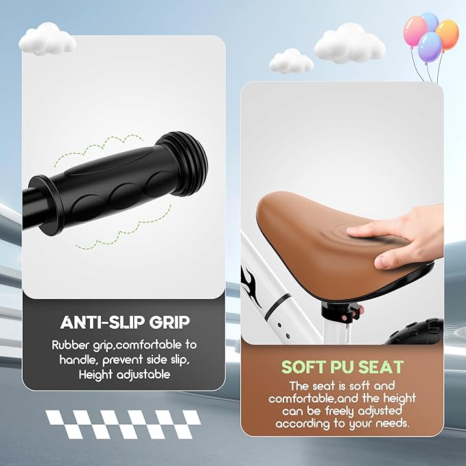 - 【Worry-Free Adventures】We understand that safety is top priority for child. Our toddler balance bike features a core frame constructed with a wide, sturdy carbon steel . It undergoes rigorous stress testing for stability, supporting up to 110 lbs. You never have to worry about the frame bending or breaking, even if your child is loves to bounce while riding. Additionally, the baby balance bike is equipped with non-slip rubber handles and a soft PU seat for a more comfortable riding experience.