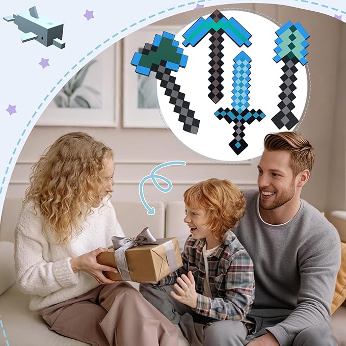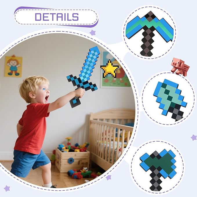 - [Child-Friendly Design & Easy Storage] Rounded tip protection no loose parts. Includes Sword, Axe, Pickaxe and Shovel combos for group play. perfect for small bedrooms or playrooms.