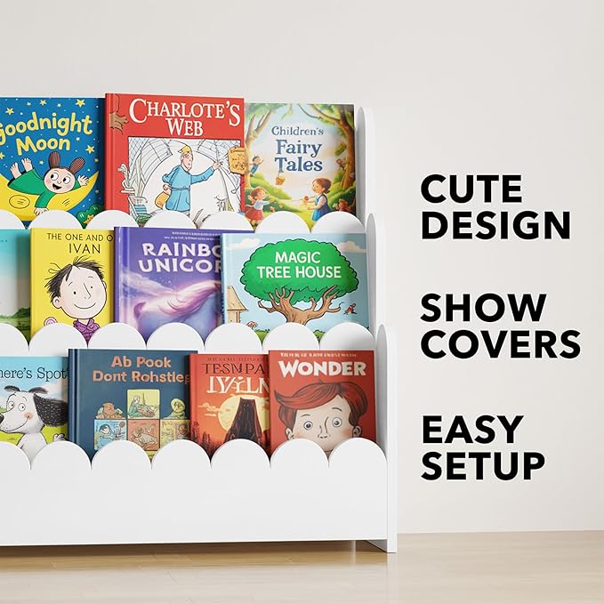 - STURDY CONSTRUCTION - Made of durable wood, this scalloped book shelf ensures safety and durability; It keeps your book organizer or childrens bookshelf clutter-free while adding charm to any room bookshelf setup