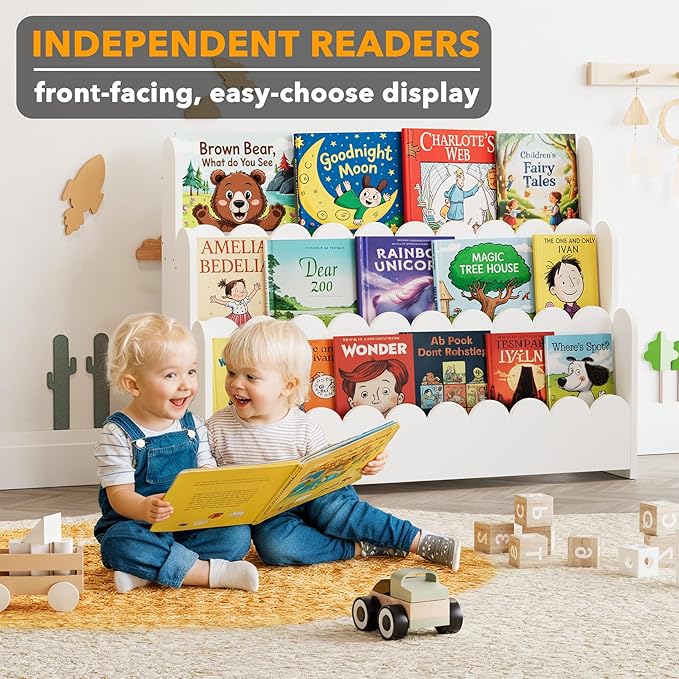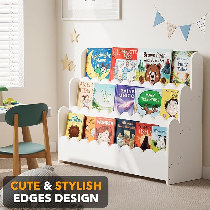 - 3-TIER WHITE MONTESSORI BOOKSHELF - Transform any nursery or playroom with this scalloped book shelf, doubling as a baby bookshelf and toy storage; Its compact size fits into toddler rooms or kids bookcases; SIZE: 36.7"W x 10.7"D x 27.6"H