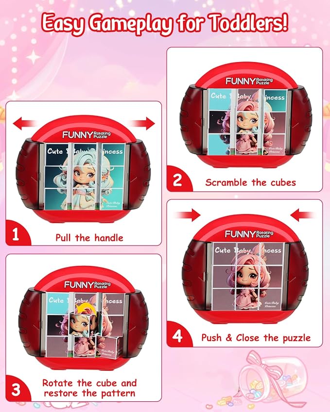 Rotating 3D Puzzle for Kids 3 4 5 6 7 Year Old, 4 Puzzles in 1, Handheld Game Fidget Toys for Travel, Cars & Plane, Fine Motor Skills Developing (Cute Little Princess)