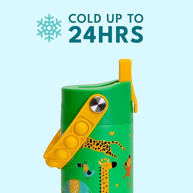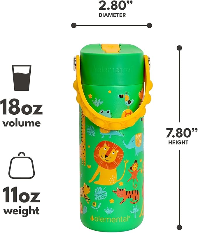 Elemental Insulated Kids Water Bottle, Stainless Steel Water Bottle with Straw Lid & Pop-It Handle, Leak-Proof Water Bottles for School, Boys or Girls, Travelling and Sports, 18oz - Green Jungle