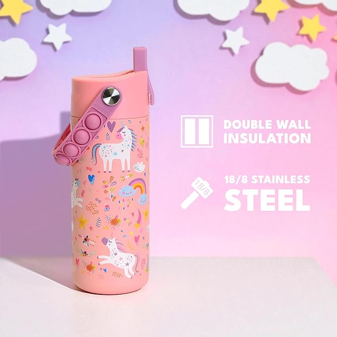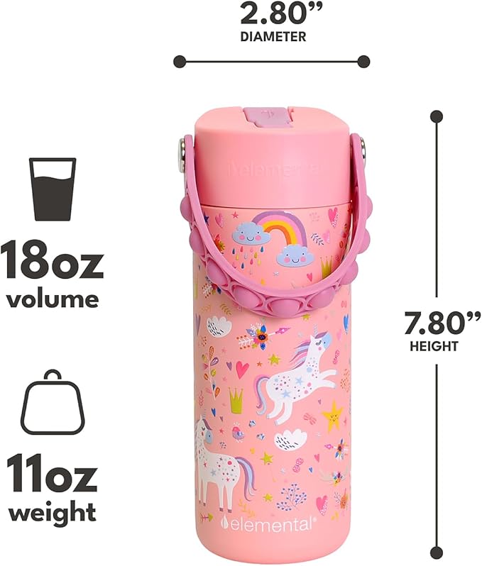 Elemental Insulated Kids Water Bottle, Stainless Steel Water Bottle with Straw Lid & Pop-It Handle, Leak-Proof Water Bottles for School, Boys or Girls, Travelling and Sports, 18oz - Pink Unicorn