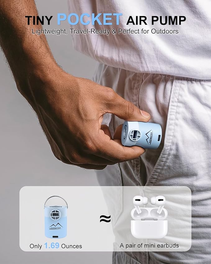 - Ultra-Mini Design, Easy to Carry - This battery powered vacuum bag pump weighs only 1.69 ounces and has a compact size of 1.96 x 1.57 x 1.45 inches, making it lighter than an egg. This hand held tiny air backpack pump for inflater mat sleep pad fits easily into your backpack or pocket, making it perfect for camp, hiking, and beach outdoor activities. With no external power source required, this sleeping pad backpacking pump is your go-to gadgets for on-the-go convenience.