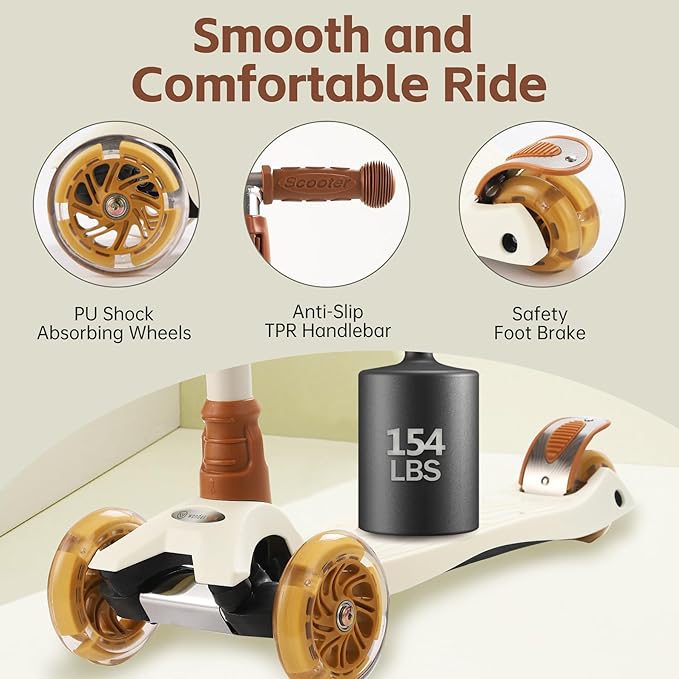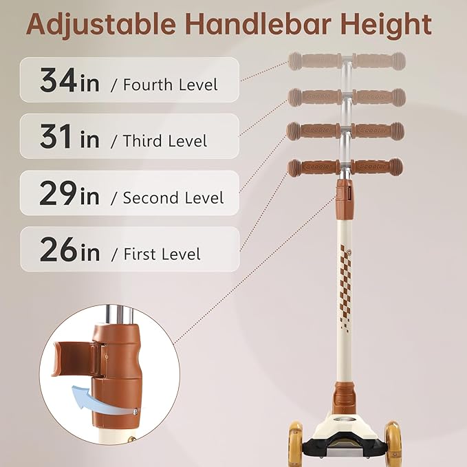 - 【Adjustable Scooter for Growing Riders】The adjustable handlebar scooter offers four height levels, perfectly fitting riders from ages 3–13. With soft, anti-slip TPR grips, kids of different heights can hold the scooter comfortably and ride with stability.