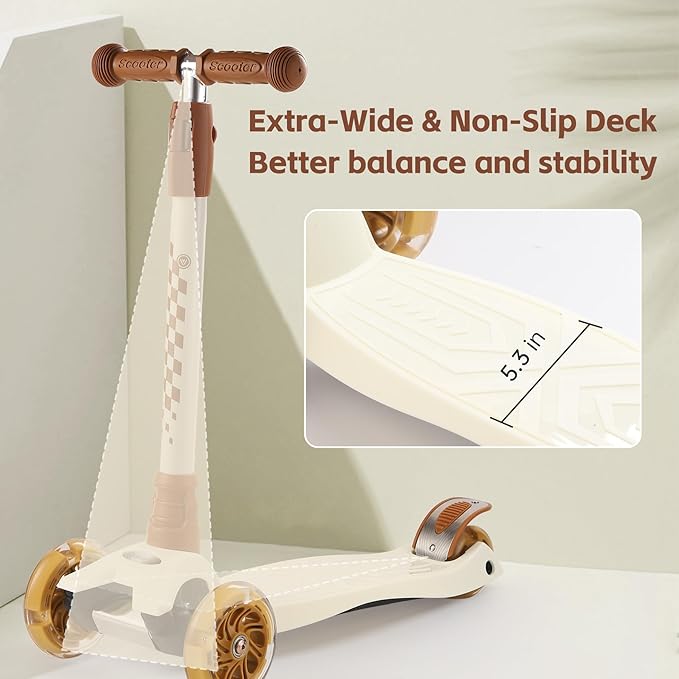 - 【Stable 3-Wheel Scooter for Kids】This 3 wheel scooter for kids provides greater balance and control than a two-wheel scooter, making it ideal for beginners. The lean-to-steer scooter design allows kids to turn by leaning their body left or right, helping them improve balance, coordination, and riding confidence.