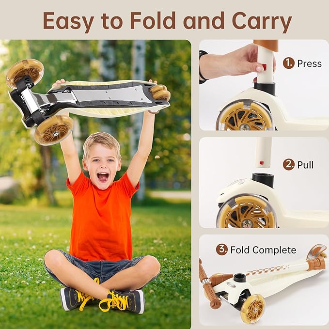 - 【Foldable Scooter & Easy Assembly】Our foldable kids scooter is easy to set up and store. Just insert the handlebar into the deck until it clicks — no tools needed. The detachable design makes it portable and perfect for travel, school, or outdoor play.