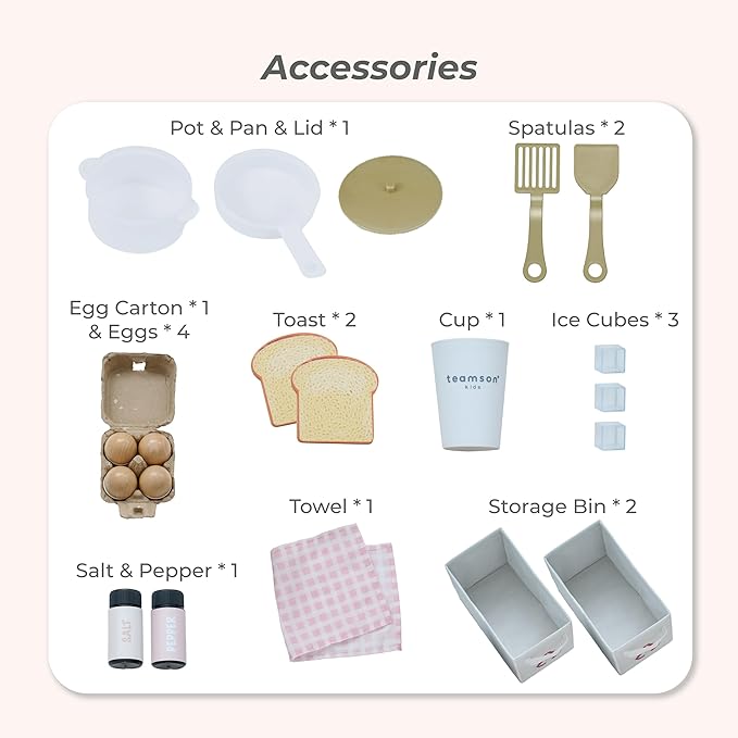 - Full Set of 21 Accessories Ensures Ready-to-Play Fun: Comes complete with cookware, utensils, salt and pepper shakers, play eggs, ice cubes, and more all stored inside the kitchen. No extra purchases needed. Promotes organizational habits and imaginative creativity from day one.