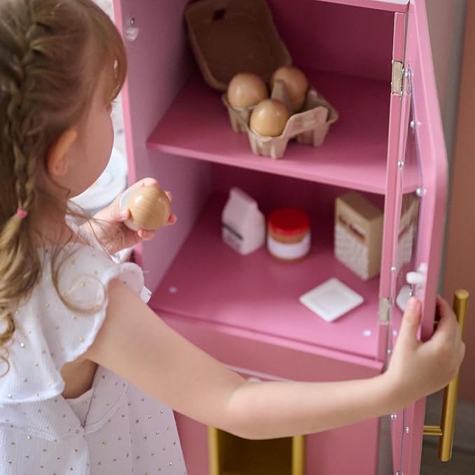 - Interactive Real-Life Features Encourage Skill Growth: Includes clickable knobs, pop-up toaster, functioning ice dispenser, microwave, oven window, and recycling bins. These features support fine-motor development, sensory exploration, early role-play skills, and cognitive storytelling abilities.