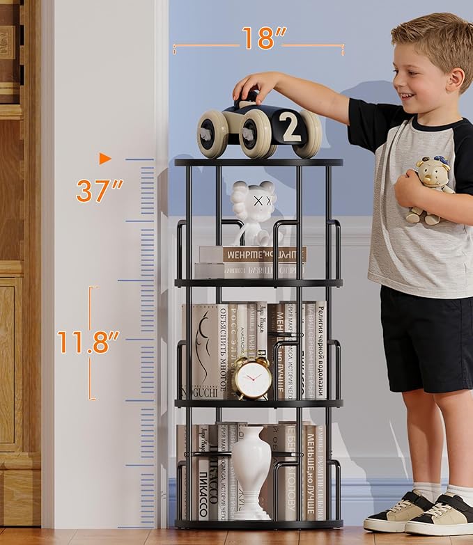- 【Space-Saving Turning Bookshelf】Standing tall with multi-tier storage, this open revolving bookcase takes up minimal floor space while offering maximum capacity. Each shelf is 17.71" in diameter with 11.8" of height between levels, and can hold 12–30 books per tier. The rotating design is ideal for small apartments and condos