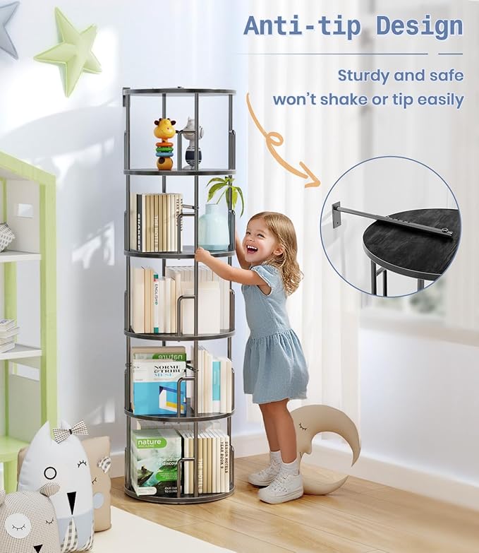 - 【Customizable Swivel Bookshelf】 Mix and match 1–5 tiers to fit your space. The anti-tip system and adjustable height make it safer for kids to reach, while the sturdy base and tall shelves keep everything stable and tidy