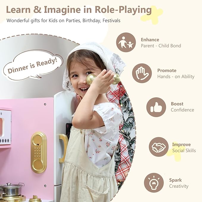 Kinder King Wooden Kids Play Kitchen, Toy Kitchen Playset for Toddler, Pretend Oven, Microwave, Telephone, Chalkboard, Interactive Doors, Knobs, Realistic Kitchen Sets for Boys Girls Age 3+, Gold