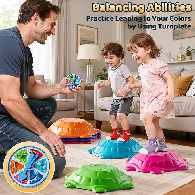 - Practice Through Playing: Turn the Turnplate and kids leaping to the selected obstacle toys. As preschool sensory toys for toddlers 3-4, kids play the stepping stones with parents for developing hand-eye coordination, color recognition and sorting ability