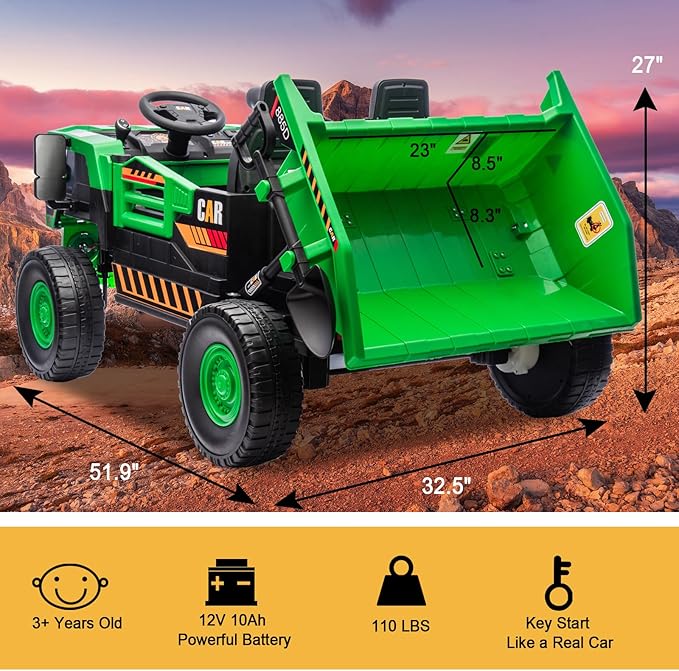 - [12V 10AH Ride on Truck] LUIBAS ride on toy car is realistic like a real truck which give your young farmer a delightful surprise with this real-looking dump tractor. This kids ride on electric car is equipped with a rechargeable charger, a large capacity, bright LED lights and powerful motors. Maximum load of 110 LBS. Dimension: 51.9*32.5*27 in