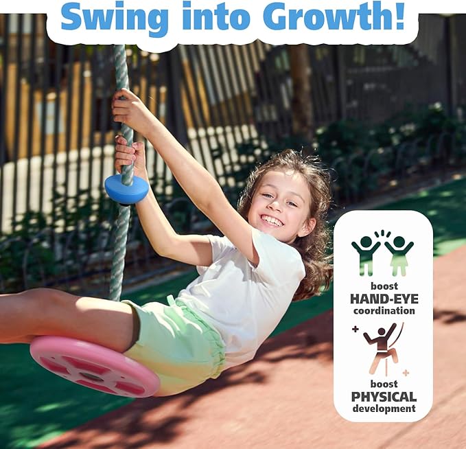 - PREMIUM QUALITY - Our swings with disc seat and platforms is ASTM F963-23 certified and meets CPSIA & CPSC toy safety requirements. Rope crafted with a braided design from high-quality HDPE material. Thick, durable and soft-touch for a safe, comfy grip. Holds up to 220lbs weight capacity. Perfect swing set accessory for installation on backyard swing sets, playhouses, playground swing sets or trees, tree houses, It's versatile enough for use as a climbing rope or a classic swing.