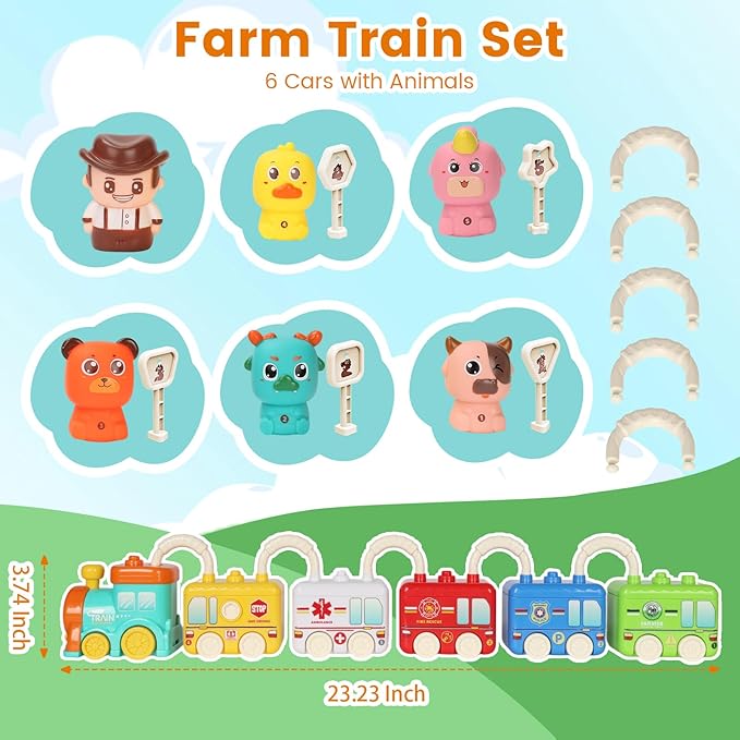- 【Unlock & Discover Learning Fun】Unlock a world of surprises! Each train car opens with the included key, revealing cute rubber farm animals inside. This interactive play train encourages fine motor skills, curiosity, and imaginative exploration. Perfect Montessori learning toy for toddlers 2-4 years who love hands-on discovery and surprise play.