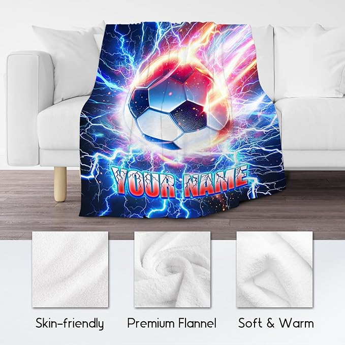 Soccer Blanket for Boys Personalized Kids Throw Gifts - Custom Name Soft Plush Blankets for Couch, Bedroom & Living Room (4 Sizes Choose)