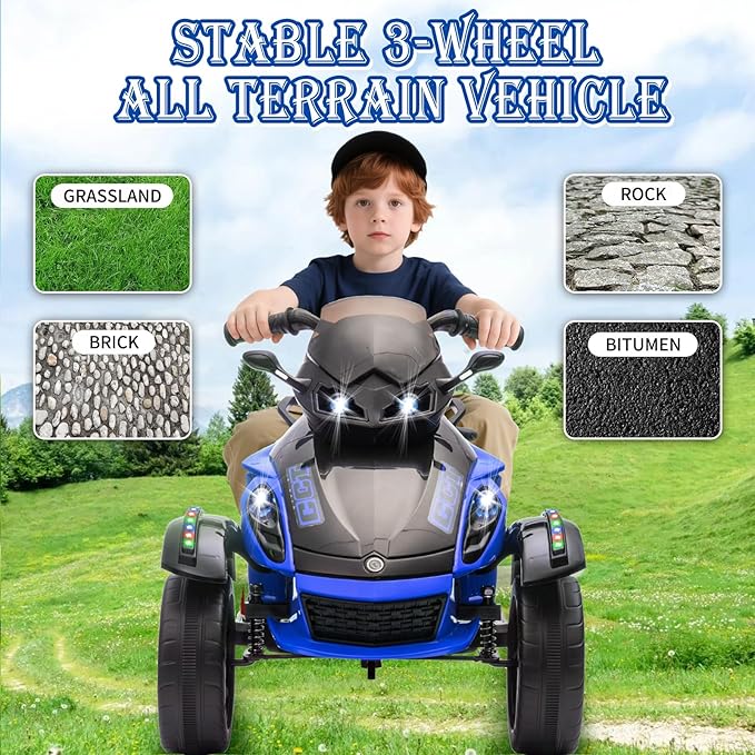 Xinyonxin 12V Kids Electric ATV, 3-Wheeler Motorcycle Ride on Toys for Toddlers w/Music, LED Lights, USB, One-Button Start, Forward/Reverse, Electric All-Terrain Car, Gift for Age 3+ (Blue)