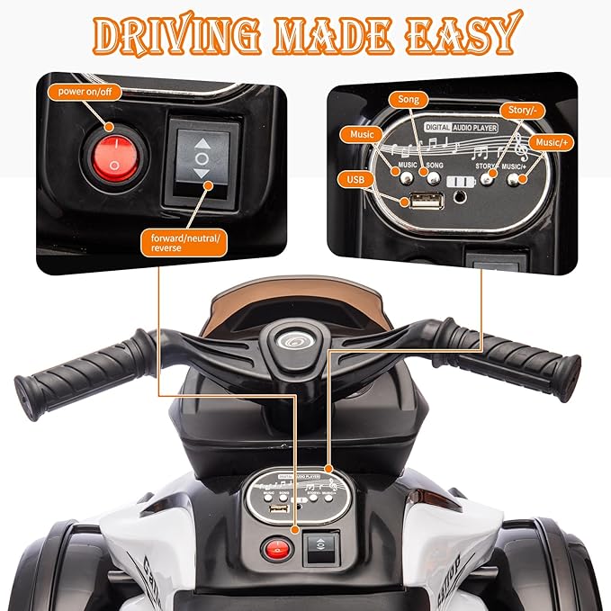 - Exciting Lights & Sounds: Your child will love this 3-wheel electric motorcycle with bright LED lights and a built-in music player (volume adjustable). Plug in a USB drive to play their favorite songs, turning every ride into a joyful adventure!