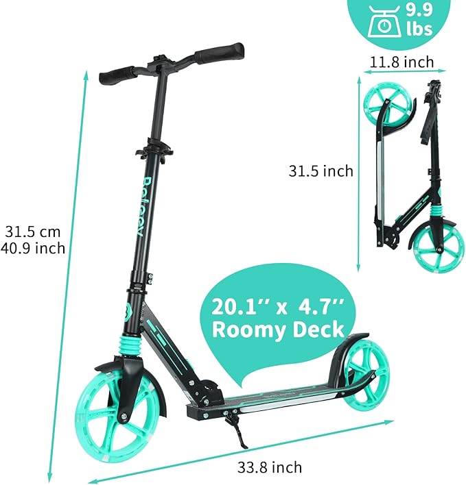 - Easy to Use and Carry: This lightweight scooter requires no assembly—just unfold the T-bar, adjust the height, secure it, and start riding. The scooter folds and unfolds with a single press, making it easy to store and carry. Ideal for travel, you can easily fit it in your car or take it on public transportation, making it a great companion for any journey.