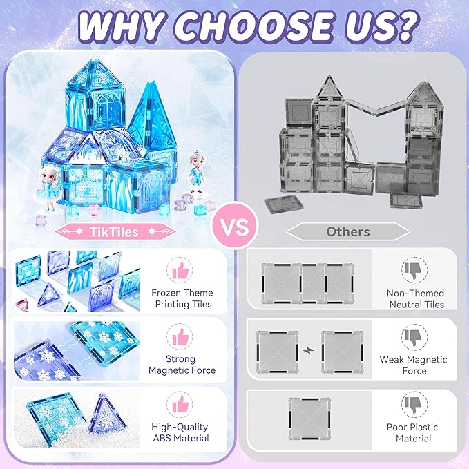 - Create a Snow Princess Castle with 101 Pieces: This magnet toy set includes 88 magnetic tiles, 1 princess doll, 1 prince doll, 3 snowflakes and 10 ice blocks, empowering kids to build their own enchanting winter castle and kingdom. The snowy theme sparks imaginative pretend play as royalty in a magical world.