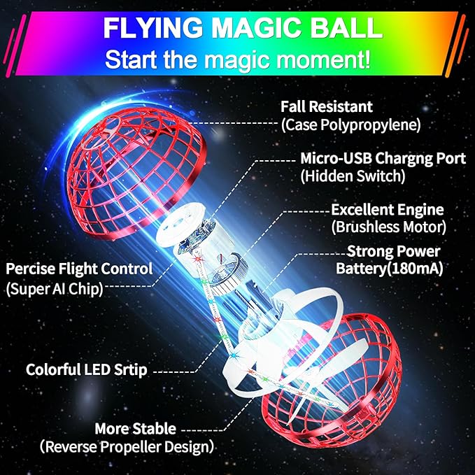 - Super Cool Flying Toys Gift: One package includes a flying floating ball, USB charging cable and User manual, providing everything you need for an amazing flying experience. This children's flying toys is the perfect gift for birthdays, Halloween, Thanksgiving and Christmas. It's also a fantastic gift choice for Easter, Children's Day, and Valentine's Day. It's a wonderful enriching gift that works perfectly for kids, teenagers, and adults—bringing joy to every age group