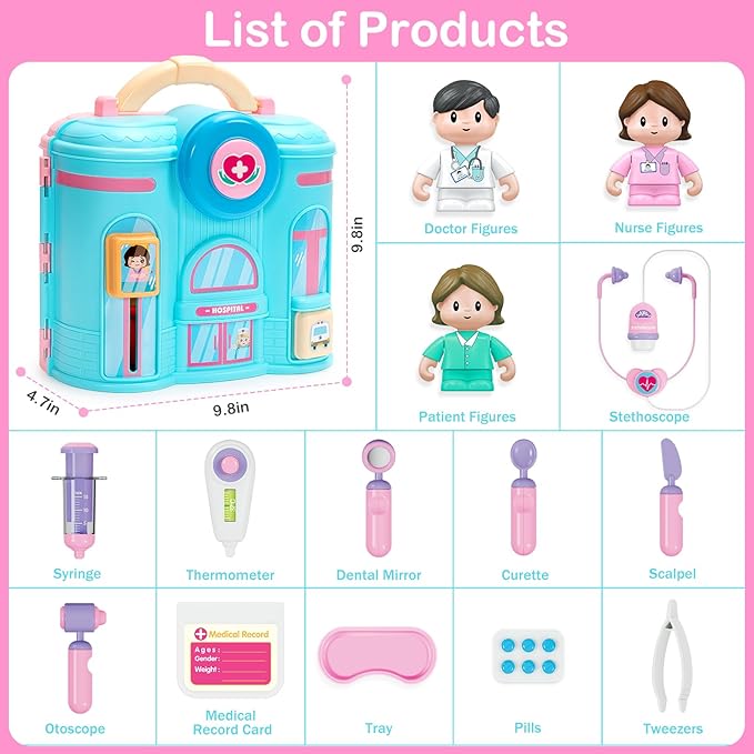 - All-in-one Doctor Playset: Our unique kids doctors play set comes with a hospital-scene box and a variety of doctor tool accessories, including doctor, nurse and patient figurines, stethoscope, syringe, thermometer, dental mirror, scalpel, curette, otoscope, medical record card, pills, tray, and tweezers, helping girls get familiar with hospital scenes and medical tools. Open the box to experience an immersive doctor role-playing game.