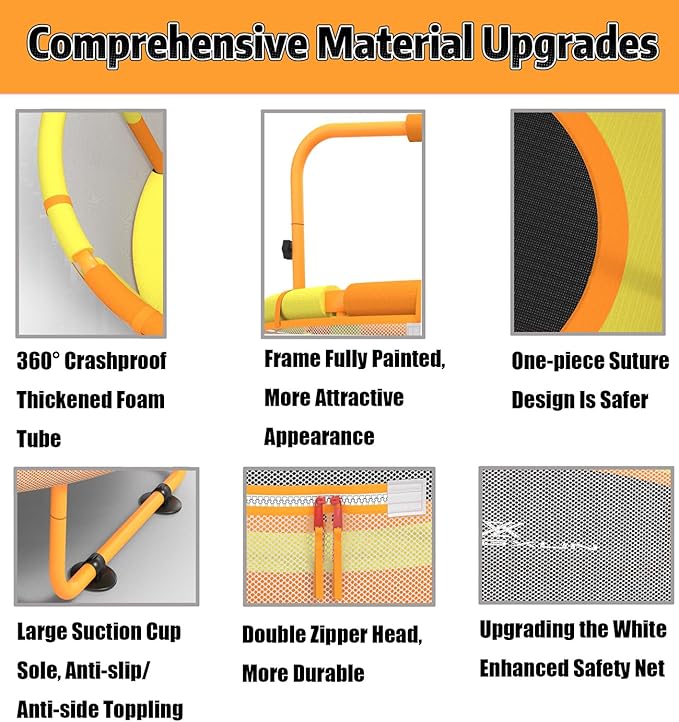 - [SAFETY UPGRADE] LANGXUN 60-Inch Mini Kids Trampoline features a baby fence-style frame structure, a new generation of thickened and heightened safety net with 360° surrounding thick safety foam tubes. The stitched jump mat and protective pad design prevent contact with the springs, ensuring children's foot safety. The large suction cups on the feet firmly grip the ground, providing added stability during play. Suitable for children aged 1 to 8.