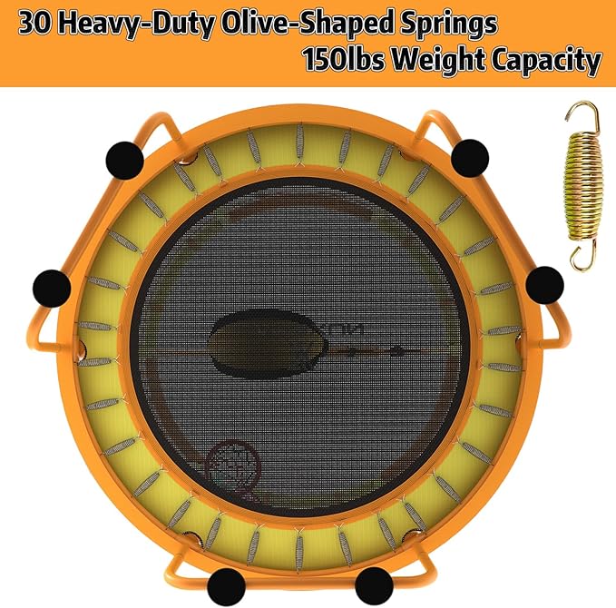 - [2025 MATERIAL UPGRADE] The trampoline is constructed with thickened steel pipes and a two-tier baby fence-style metal frame structure, making it more solid and durable. 30pcs 3.5-inch springs provide excellent bounce, with a waterproof and thickened wear-resistant PP protective pad. The U-shaped foot design, along with large anti-slip suction cups, ensures stable play without tipping over.