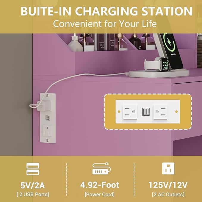 - 【Convenient Charging Station】The vanity mirror with lights desk and chair is equipped with a built-in charging station, including 2 AC outlets and 2 USB ports, allowing you to sit at your makeup vanity and use your hair dryer or curling iron within easy reach and charge your phone, tablet, or other electronics