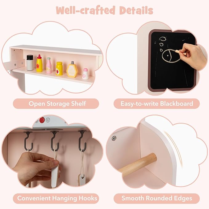 - Maximized Space with Style: The unique corner design of our wooden play kitchen smartly utilizes room space, enabling multiple children to cook and interact simultaneously. This setup encourages social skills and cooperative play, making it an excellent addition to any play area or classroom.