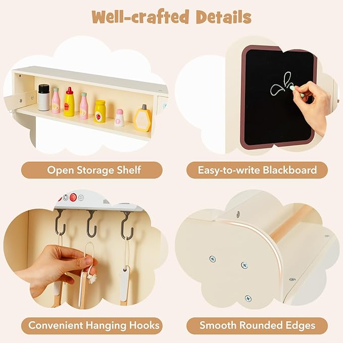- Maximized Space with Style: The unique corner design of our wooden play kitchen smartly utilizes room space, enabling multiple children to cook and interact simultaneously. This setup encourages social skills and cooperative play, making it an excellent addition to any play area or classroom.
