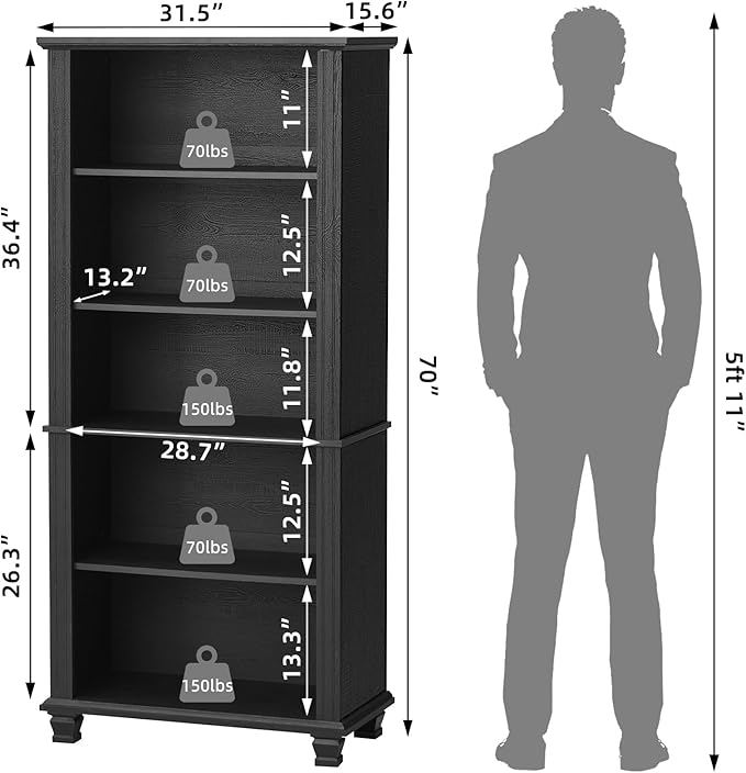 - [Large-Capacity Storage Compartments] Each storage shelf of this large book shelf is equipped with 3 adjustable heights, allowing for personalized customization according to your storage needs. The mid century modern bookcase features 5 tier open display and storage compartments with ample space, which can easily hold a large number of books, collectibles, or storage boxes.Dimensions: 15.6"D x 31.5"W x 70"H