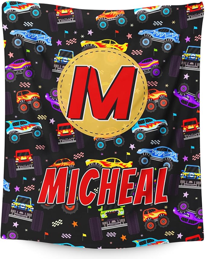 Boys Blankets, Personalized Truck Blanket with Initial Monogram for Kids Toddlers, Cute Car Throws Blanket Gift, Soft Cozy Flannel Throw for Sofa Bed Couch Decor